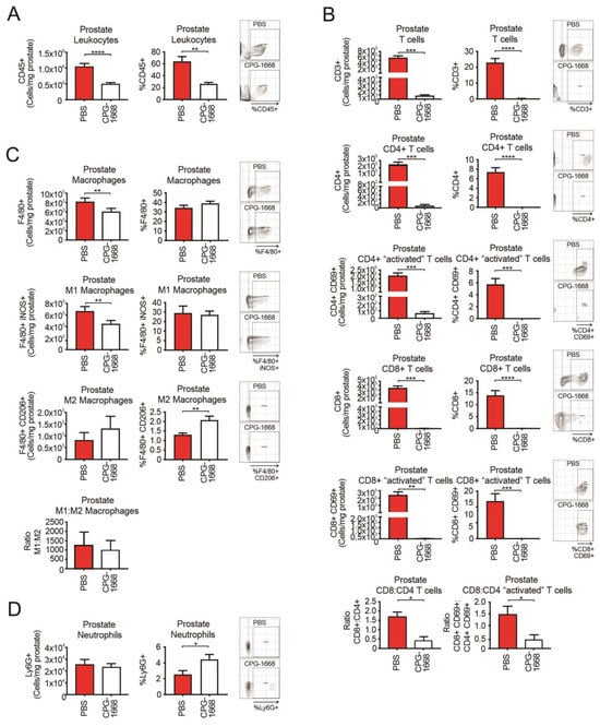 An analysis of the whole blood revealed no differences in total leukocytes with treatment (Figure 3A). Overall, CD3+ T-cell populations were also similar between mice, although there were fewer total and activated CD4+ T cells in CPG-1668-treated mice compared to PBS control mice (Figure 3B). Interestingly, CPG-1668 treatment boosted the frequency of total and activated CD8+ T cells. We observed a significant increase in the ratio of CD8+ to CD4+ T cells in mice that received CPG-1668 compared to untreated mice (Figure 3B), indicating that more cytotoxic T cells were in circulation. This observation contrasts with the T-cell ratios in the prostate and may reflect the persistent immunostimulation induced by continual CPG-1668 delivery. Indeed, CPG-1668 treatment also enhanced the number of circulating F4/80+ macrophages, of either M1 or M2 subtypes (Figure 3C), and neutrophils (Figure 3D). According to M1–M2 ratios, the majority of circulating macrophages in tumor-bearing mice were M1 like, and this appeared to increase slightly with CPG-1668 treatment.