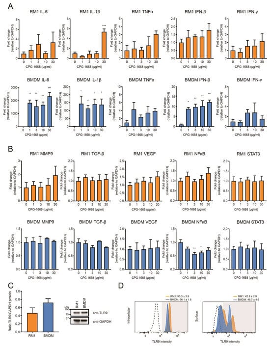RM1 (1 × 105) or BMDM (2 × 105) cells were seeded in 12-well plates overnight and then treated with increasing concentrations of CPG-1668 for 24 h. Total RNA was extracted using an RNeasy Mini Kit (Qiagen, Hilden, Germany). Then, cDNA was synthesized using the High-Capacity cDNA RT kit (Thermo Fisher Scientific) from 2 µg total RNA according to the following protocol: 25 °C for 10 min, 37 °C for 120 min, 85 °C for 5 min, and kept at 4 °C until collection using the Veriti Thermal Cycler (Applied Biosystems, San Francisco, CA, USA). Quantitative polymerase chain reaction (qPCR) was carried out using the TaqMan Fast Advanced Master Mix (Thermo Fisher Scientific) and analyzed on an Applied Biosystem QuantStudio 7 Flex Real-Time PCR System (Thermo Fisher Scientific). Assay On-Demand Gene Expression Assay Mix primers for IL-6, IL-1β, IFN-β, TNF-α, IFN-γ, MMP9, TGF-β, VEGF, NFκB, STAT3, and GAPDH were used. Quantitative values were obtained from the threshold-cycle (Ct) number and gene-expression analysis was performed using the comparative Ct method. The target gene-expression level was normalized against GAPDH mRNA expression for each sample and data was expressed relative to appropriate controls.