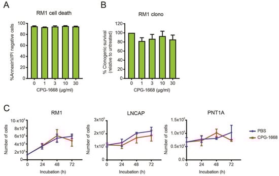 To address whether TLR9 stimulation by CPG-1668 directly impacts cell viability, RM1 cells were treated in vitro, and cell death was determined by annexin-V/propidium iodide staining or colony-forming assays. RM1 cells remained viable after 48 h incubation and maintained similar colony-forming capacity regardless of TLR9 stimulation (Figure 6A,B). The effect of CPG-1668 on cell proliferation was also assessed in RM1 cells (mouse prostate cancer), as well as LnCAP human prostate cancer cells, and PNT1a nonmalignant normal human prostate cells. All PBS-treated cultures increased in cell numbers over the course of 72 h. CPG-1668 treatment (10 µg/mL/day) over this period did not alter proliferation in any of the cell lines (Figure 6C). This finding supports the lack of effect that CPG-1668 pretreatment had on RM1 cells prior to in vivo engraftment; it neither caused tumor cell death nor accelerated tumor growth. This further implicates enhanced antitumor immune stimulation upon CPG-1668 delivery in vivo as the mechanism of tumor suppression rather than a direct effect on RM1 cells.