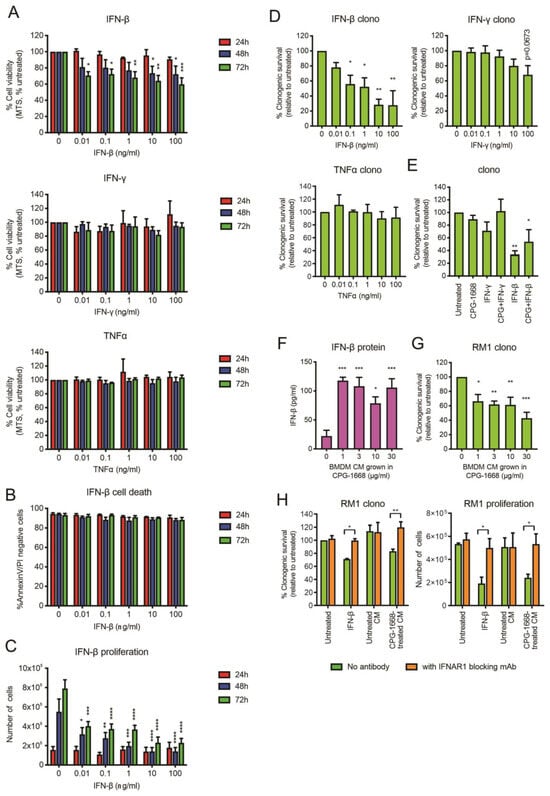 RM1 cells are sensitive to the growth inhibitory effects of IFN-β secreted by CPG-1668-stimulated macrophages. (A) RM1 cells were treated with various concentrations of recombinant cytokines (IFN-β, IFN-γ, or TNFα) for 24, 48, or 72 h; then, cell viability was determined by MTS absorbance. (B) Cell death (measured by AnnexinV-FITC and propidium iodide (PI) staining) or (C) proliferation (measured by the total number of live cells) was also assessed after incubation with IFN-β at the same time points. (D) The colony-forming potential of RM1 cells was determined after 24 h incubation with recombinant cytokines. (E) The clonogenicity of cells following cotreatment with CPG-1668 (10 µg/mL) and IFN-γ (100 ng/mL) or IFN-β (100 ng/mL) was also determined. (F) The amount of IFN-β secreted into the culture media of BMDMs grown in various concentrations of CPG-1668 was determined by ELISA. (G) RM1 cells were grown in BMDM-conditioned media (CM) for 24 h; then, the colony-forming potential was determined. (H) Some cells were pretreated with 50 µg/mL IFNAR1 blocking monoclonal antibody for 1 h before the addition of BMDM-derived CM or recombinant IFN-β (1 ng/mL). The colony-forming potential after 24 h or cell proliferation after 48 h was determined. Data represent n = 3–4 per group and expressed as mean ± SEM. Statistical analysis was conducted using (D–G) ordinary one-way ANOVA followed by Dunnett’s post hoc test for multiple comparisons or (A–C,H) two-way ANOVA followed by Sidak’s post hoc test for multiple comparisons (* p < 0.05, ** p < 0.01, *** p < 0.001, **** p < 0.0001).