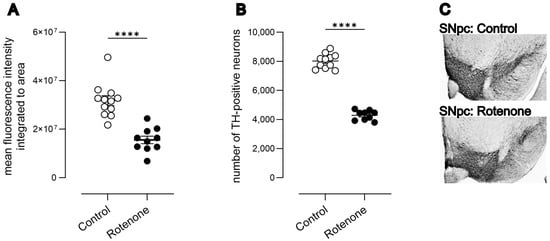 Using unbiased 3D stereology based upon an optical fractionator, we quantified the number of TH-positive neurons in the SNpc. We observed a 50% reduction in TH-positive neurons of the SNpc ((Figure 1B) Mann–Whitney U = 0, N = 9–11; control median: 8153, 25–75% percentile: 7521–8387; rotenone median: 4451, 25–75% percentile: 3958–4560; p < 0.0001). The number of neurons in normal mice [19,24,39] and the reduction in TH-positive neurons in SNpc following intrastriatal rotenone is highly consistent with previously published data [19,24].