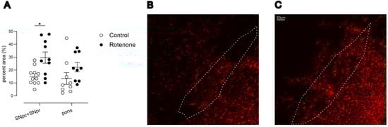 Inflammation in the SNpc is a consistent feature of PD, including the presence of reactive astrocytes [41]. This inflammation has long been considered a downstream response to the death of dopaminergic neurons [42]. We indeed noted a specific increase in GFAP-labelled astrocytes in the SNpc and SNpr of rotenone-treated mice compared with controls (treatment effect, F (1, 19) = 8.8, p < 0.01; Figure 2A) as we did not see any significant changes in GFAP expression in the more caudal pons.