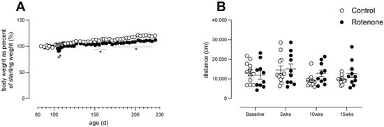 (A) Body weights from control- (N = 12) and rotenone-treated (N = 10) mice, expressed as percent of starting weight. Asterisks indicate significant differences between control and treated groups. Post hoc tests: * p < 0.05, ** p < 0.01. Symbols show group mean ± sem. Note that sem are obscured within symbols for many datapoints. (B) Activity in a novel environment (open field activity) over a period of 1 h in control- (N = 12) and rotenone-treated (N = 10) mice. No difference was detected between groups. Symbols are of individual mice, and horizontal bars show group mean ± sem.