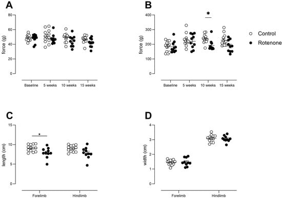 (A) Forepaw grip strength from control- (N = 12) and rotenone-treated (N = 10) mice. No difference between groups was observed. Symbols show individual mice, and horizontal bars show mean ± sem. (B) All-four-paw grip strength from control- (N = 12) and rotenone-treated (N = 10) mice. Although rotenone-treated mice, in general, showed reduced grip strength, it was only specifically significant at 10 weeks. * p < 0.05 Symbols show individual mice, and horizontal bars show mean ± sem. (C) Measurements of stride length of forelimbs and hindlimbs from control- (N = 12) and rotenone-treated (N = 10) mice. A minor deficit in forelimb stride length, only, was observed. * p < 0.05. Symbols show individual mice, and horizontal bars show mean ± sem. (D) Measurements of stride width of forelimbs and hindlimbs from control- (N = 12) and rotenone-treated (N = 10) mice. No differences between groups were observed. Symbols show individual mice, and horizontal bars show mean ± sem.