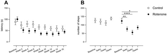 (A) Rotarod performance of control (N = 12) and rotenone-treated (N = 10) mice. Rotenone-treated mice showed a robust decline in performance. Symbols show group mean ± sem. (B) Number of continuous hindlimb steps in control- (N = 12) and rotenone-treated (N = 10) mice. A significant reduction in number of continuous hindlimb steps in rotenone-treated mice was observed. Asterisks indicate significant differences compared with baseline, * p < 0.05, ** p < 0.01, and **** p < 0.0001. Symbols show group mean ± sem.