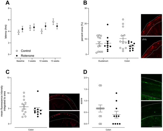 (A) Latency to expel red faecal pellets following administration of the non-absorbable dye carmine red in control- (N = 12) and rotenone-treated (N = 10) mice, i.e., whole-gut motility. No difference in latency was noted in repeatedly tested rotenone-treated mice compared with control-treated mice. Symbols are of group mean ± sem. (B) GFAP-positive staining, depicted as percent above background, in duodenum and colon from control- (N = 12) and rotenone-treated (N = 10) mice. No change was observed between groups. Symbols are of individual mice, and horizontal bars show group mean ± sem. Photomicrographs depict exemplar images from colon section, control (top) and rotenone (bottom, scalebar = 50 μm, for both photomicrographs). Dotted lines depict outer muscle layers (longitudinal + circular). (C) Mean integrated fluorescence intensity of PGP 9.5, a pan-neuronal marker that was used to detect enteric ganglia in longitudinal and circular muscle layers of colon from control (N = 12) and treated (N = 10) mice. No change was observed between groups. Symbols are of individual mice, and horizontal bars show group mean ± sem. Photomicrographs depict exemplar images from colon section, control (top) and rotenone (bottom; bottom, scalebar = 100 μm, for both photomicrographs). Dotted lines depict outer muscle layers (longitudinal + circular). (D) LAMP1-positive staining was scored on criteria of 0, + or ++ in outer longitudinal and circular muscle layers of colon from control- (N = 12) and rotenone-treated (N = 10) mice. No change was observed between groups. Symbols are of individual mice, and horizontal bars show group mean ± sem. Photomicrographs depict exemplar images from the colon, control (top) and rotenone (bottom, scale bar = 100 μm, for both photomicrographs). Dotted lines depict outer muscle layers (longitudinal + circular).