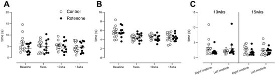No consistent deficits in forelimb grip strength were observed in the rotenone-treated mice (Figure 4A time × treatment interaction, F (3, 60) = 0.76, ns). Although we note that all-four-paw grip strength tended to be lower in the rotenone-treated group (effect of treatment F (1, 20) = 5, p < 0.05), this did not reach significance when time was taken into account (Figure 4B time x treatment interaction F (3, 60) = 2.1, ns).