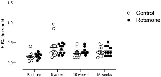 The 50% withdrawal threshold in control- (N = 12) and rotenone-treated (N = 10) mice. No change in sensation of punctate mechanical stimulus was noted in rotenone-treated mice compared with the controls. Symbols are of individual mice, and horizontal bars show group mean ± sem.