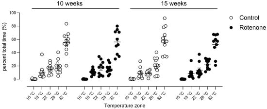 Empiric preference for heat or cold was assessed at weeks 10 and 15. The animals were allowed to freely explore an open arena (100 × 10 × 20 cm) over a period of 30 min, and their activity was recorded using Ethovision XT V8 (Noldus, Wageningen, The Netherlands). The arena comprised a glass floor, placed upon a hot plate at one end and ice packs at the other end. Preliminary experiments showed that floor temperatures ranged from 32 °C on one side to 10 °C on the other side and that temperatures remained constant over a period of 30 min. The proportion of time spent in each temperature zone was analysed automatically using Ethovision.