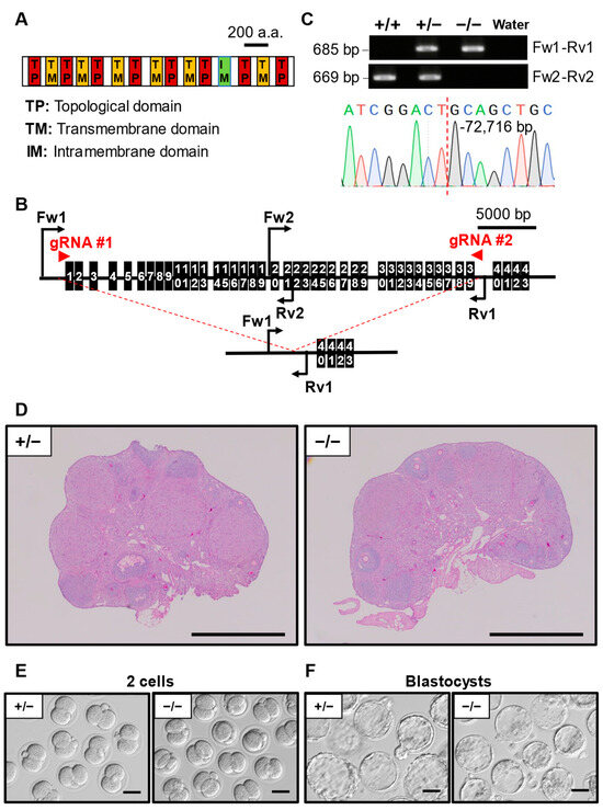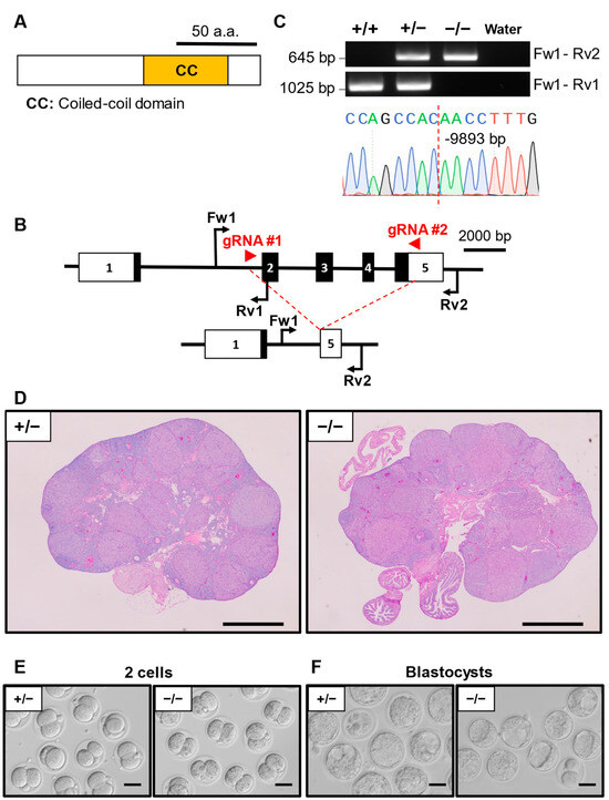 All KO mouse lines in this study were generated using the CRISPR/Cas9 genome editing system. A set of guide RNAs (gRNAs) was designed using web tools CRISPRdirect (crispr.dbcls.jp) and CRISPOR (crispor.tefor.net). Based on the tools, we selected a set of gRNAs with high criteria scores and minimized off-target frequency (Table S1). The crRNA and tracrRNA were purchased from Integrated DNA technologies (IDT, Coralville IA, USA). The crRNA and tracrRNA were diluted with nuclease-free water and subsequently denatured at 95 °C for 1 min and allowed to anneal into functional gRNAs by cooling at room temperature. The gRNAs were then mixed with TrueCut™ Cas9 Protein v2 (Thermo Fisher scientific, Waltham, MA, USA) solution at 37 °C for 5 min. The final concentrations of gRNA and Cas9 used were 100 ng/µL and 40 ng/µL, respectively. The ribonucleoprotein complex of crRNA/tracrRNA/Cas9 was then introduced into the B6D2F1 zygotes by electroporation using an NEPA21 Super Electroporator (NEPAGENE, Chiba, Japan). For zygote collection, WT B6D2F1 female mice were superovulated with a serial intraperitoneal injection of CARD HyperOva (2.5 units, Kyudo Co., Saga, Japan) [15] followed by human chorionic gonadotropin (hCG, 5 units, ASKA Animal Health Co, Tokyo, Japan) and caged with B6D2F1 males. Females with observable plugs the following morning were dissected and two-pronuclear (2-PN) zygotes were collected from their oviducts for electroporation. Electroporated embryos were cultured in potassium simplex optimization medium with amino acid (KSOMaa) medium [16] overnight to develop into 2-cell-stage embryos. Twenty embryos were transplanted into the oviducts of a 0.5-day pseudopregnant ICR mouse. After 19.5 days, the founder generation was obtained by natural delivery or cesarean section. The genomes of F0 generation mice were validated by genomic polymerase chain reaction (PCR). Heterozygous F1 generation mice whose deletion sites were confirmed by Sanger sequencing were mated with each other to obtain the F2 homozygous mouse. Genotyping was performed through PCR using primers listed in Table S2. Some KO mice generated in this study will be available to other investigators through the RIKEN BioResource Research Center, Japan (https://web.brc.riken.jp/en/, accessed on 1 April 2024) (RBRC numbers; Ccdc58 11982, D930020B18Rik 11967, Elobl 11996, Oas1h 11970, Pramel34 11671, Pramel47 11672, Pkd1l2 11968, Tubal3 11171, Zar1l 11456), or Center for Animal Resources and Development (CARD), Kumamoto University, Kumamoto, Japan (http://cardb.cc.kumamoto-u.ac.jp/transgenic/, accessed on 1 April 2024) (CARD ID: Ccdc58: 3351, D930020B18Rik: 3336, Elobl:3365, Oas1h: 3339, Pkd1l2: 3337, Zar1l: 3100).