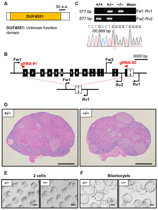 Phenotypic analysis of D930020B18Rik KO female mice. (A) Protein domain of D930020B18RIK. DUF4551: unknown functional domain. (B) KO strategy of D930020B18Rik. Black boxes indicate exons; the white box indicates an untranslated region. Two gRNAs were designed to target exon 1 and exon 13. Fw1/2: forward primer for genotyping. Rv1/2: reverse primers for genotyping. (C) Genotyping PCR result of D930020B18Rik KO mice and subsequent Sanger sequencing. (D) Histological analysis of ovary in D930020B18Rik+/− and −/−. Scale bar = 500 µm. (E) Representative pictures of 2-cell embryos after IVF derived from D930020B18Rik+/− or −/− MII oocytes and WT sperm. Scale bar = 50 µm. (F) Representative pictures of blastocyst embryos after IVF derived from D930020B18Rik+/− or −/− MII oocytes and WT sperm. Scale bar = 50 µm.