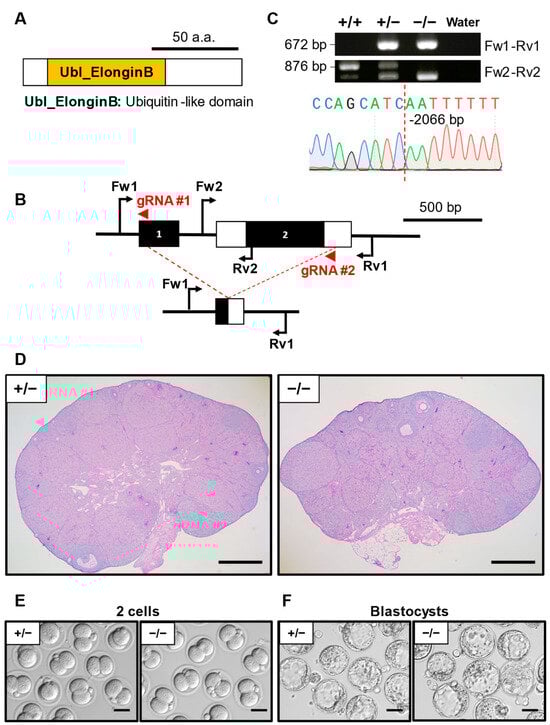 Phenotypic analysis of Elobl KO female mice. (A) Protein domain of ELOBL. Ubl ElonginB: ubiquitin-like domain. (B) KO strategy of Elobl. Black boxes indicate exons; white boxes indicate untranslated regions. Two gRNAs were designed to target exon 1 and exon 2. Fw1/2: forward primer for genotyping. Rv1/2: reverse primers for genotyping. (C) Genotyping PCR result of Elobl KO mice and subsequent Sanger sequencing. (D) Histological analysis of ovary in Elobl+/− and −/−. Scale bar = 500 µm. (E) Representative pictures of 2-cell embryos after IVF derived from Elobl+/− or −/− MII oocytes and WT sperm. Scale bar = 50 µm. (F) Representative pictures of blastocyst embryos after IVF derived from Elobl+/− or −/− MII oocytes and WT sperm. Scale bar = 50 µm.
