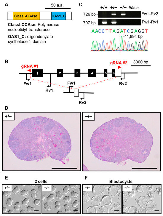 Phenotypic analysis of Oas1h KO female mice. (A) Protein domains of OAS1H. ClassI-CCAse: polymerase nucleotidyl transferase. OAS1_C: oligoadenylate synthetase 1 domain. (B) KO strategy of Oas1h. Black boxes indicate exons; the white box indicates an untranslated region. Two gRNAs were designed to target exon 1 and exon 6. Fw1: forward primer for the genotyping. Rv1/2: reverse primers for genotyping. (C) Genotyping PCR result of Oas1h KO mice and subsequent Sanger sequencing. (D) Histological analysis of ovary in Oas1h+/− and −/−. Scale bar = 500 µm. (E) Representative pictures of 2-cell embryos after IVF derived from Oas1h+/− or −/− MII oocytes and WT sperm. Scale bar = 50 µm. (F) Representative pictures of blastocyst embryos after IVF derived from Oas1h+/− or −/− MII oocytes and WT sperm. Scale bar = 50 µm.