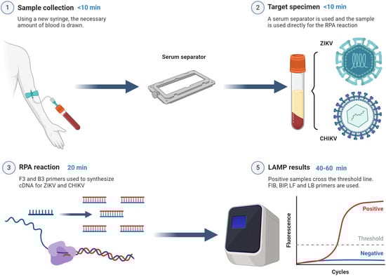 POC diagnostics have several advantages for detecting infectious diseases: they are easy to use and analyze, cost-effective (the cost of the assay according to our estimation is less than or equal to USD 10.00 per sample), quick, and require little if any laboratory infrastructure without compromising on sensitivity or specificity. Moreover, they can be deployed in hard-to-reach areas, such as endemic regions. RT-LAMP has been one of the most valuable techniques for screening and testing for viruses and other infectious diseases, and our group has used it extensively. Previously, working with ZIKV, we applied a POC device that consisted of a microfluidic cassette with independent multifunctional amplification reactors. This approach eliminated the need to isolate RNA from the samples, allowing for their direct use in RT-LAMP assays. Sensitivity was tested with saliva samples spiked with varying concentrations of ZIKV and compared with benchtop RT-LAMP [52]. This study aims to improve upon this by employing a novel two-step rapid isothermal amplification (RAMP) technique or recombinant polymerase amplification (RPA), followed by loop-mediated isothermal amplification (LAMP), using human serum samples obtained from infected individuals.