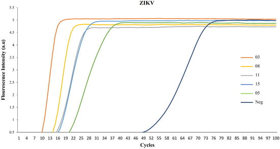 Our first objective was to assess the functionality of our method using sera samples from infected patients. In healthy donors’ serum (used as a negative control), fluorescence intensity increase was notably late during the incubation reactions (Figure 2, cycle 49). However, when using sera from ZIKV-infected patients, the intensity curves peaked at early incubation reaction cycles, indicating efficient virus detection (Figure 2, cycles 10–19). Samples 03 (cycle 10) and 08 (cycle 13) exhibited readily discernible fluorescence intensity, while samples 11, 15 (cycle 16), and 05 (cycle 19) were positive, albeit with reduced intensity.