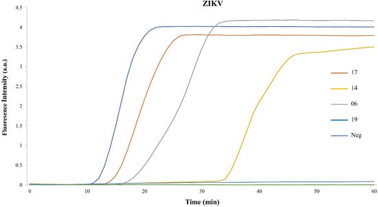 To validate the detection of our samples, we measured the fluorescence intensity as a function of time throughout the amplification reactions. Figure 3 shows that samples 19, 17, and 06 exhibited an earlier fluorescence increase than sample 14, despite them all being positive. The negative control serum remained at the fluorescence baseline over the entire 60-min incubation time.
