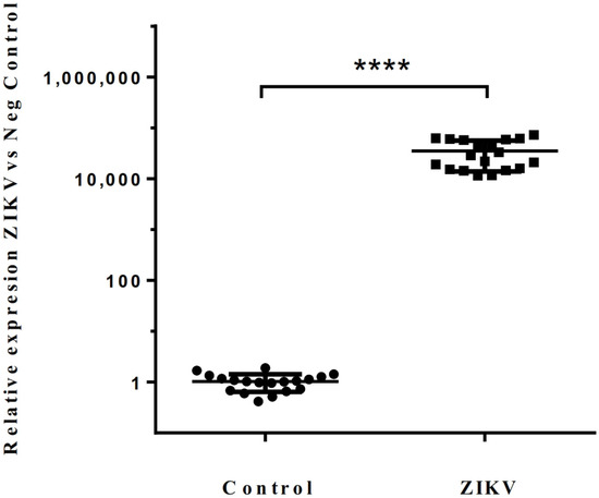 Relative detection of ZIKV samples. Data are presented as individual values with the median and range from independent experiments using all 19 samples from ZIKV. Negative serum samples were set at 1.0 to show the fold in the detection. The asterisk represents a p-value equal to 0.0001 relative to the negative serum samples.