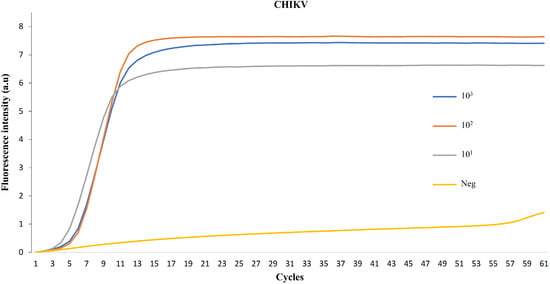 To ensure the applicability of this technique to CHIKV, we performed RT-PCR (RPA-LAMP) on Chikungunya virus samples obtained from our collaborators in Mexico, in three different concentrations. The positive results, as depicted in Figure 6, verify our method’s potential for the fast detection of RNA virus infection.