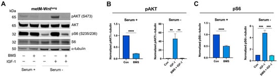 Effect of BMS-754807 on protein expression downstream of insulin receptor (IR)/insulin-like growth factor 1 receptor (IGF-1R). Representative Western blots from (A) metM-Wntlung cells; quantification of (B) pAKT, relative to AKT and alpha-tubulin; and (C) pS6, relative to S6 and alpha-tubulin. Data are presented as mean ± SEM from n = 3 experimental replicates. Con group represents cells treated with vehicle (DMSO, 2.5 µM). Differences between two groups were analyzed using unpaired t-test; differences across groups were analyzed using one-way ANOVA, followed by Tukey’s post hoc test. Asterisks denote significance: ** p < 0.01, *** p < 0.001, **** p < 0.0001. Serum + indicates 1 g/L glucose DMEM + 10% FBS. Serum—indicates 1 g/L glucose DMEM without FBS.