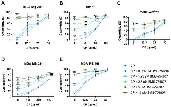 TNBC cells were treated with BMS-754807 (0–10 μM) for 24 h, followed by combination treatment with CP (0–400 μg/mL) for 48 h to investigate the anticancer benefit of IR/IGF-1R inhibition prior to chemotherapy treatment. Combination treatment with BMS-754807 (5 μM) and CP (25 μg/mL) increased cytotoxicity by 28–68% compared with treatment with CP (25 μg/mL) alone in B6C3TAg 2.51 (p < 0.05), E0771 (p < 0.0001), metM-Wntlung (p < 0.001), and MDA-MB-468 (p < 0.0001) cells (Figure 3A–C,E). In MDA-MB-231 cells, combination treatment with BMS-754807 (1.25 μM) and CP (200 μg/mL) increased cytotoxicity compared with treatment with CP alone (200 μg/mL) (p < 0.0001) (Figure 3D).