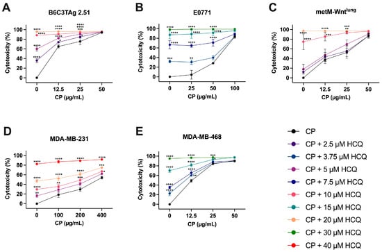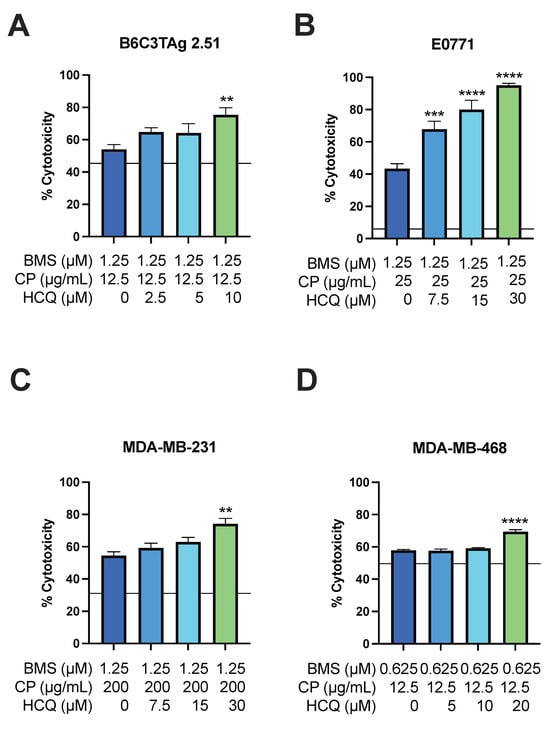 Upregulation of autophagy in cancer cells may mediate resistance to DNA-damaging chemotherapy [16,17,19]. We first investigated the effect of HCQ alone on TNBC cells and demonstrated HCQ-induced cytotoxicity in a panel of TNBC cell lines (Figure S2). We next evaluated the anticancer effect of HCQ in combination with CP. TNBC cells were first treated with HCQ (0–30 μM) for 24 h to disrupt lysosomal function before the addition of CP (0–400 μg/mL) for 48 h of combination treatment. Combination treatment with HCQ 10 μM) and CP (25 μg/mL) increased cytotoxicity by 18–41% compared with treatment with CP alone in B6C3TAg 2.51 (p < 0.0001) and metM-Wntlung (p < 0.01) cells (Figure 4A,B). Combination treatment with HCQ (15 μM) and CP (25 μg/mL) increased cytotoxicity by 9–84% compared with treatment with CP alone in E0771 (p < 0.0001) and MDA-MB-468 (p < 0.05) cells (Figure 4B,E). In MDA-MB-231 cells, combination treatment with HCQ (20 μM) and CP (100 μg/mL) increased cytotoxicity by 34% compared with treatment with CP (100 μg/mL) alone (p < 0.0001) (Figure 4D).