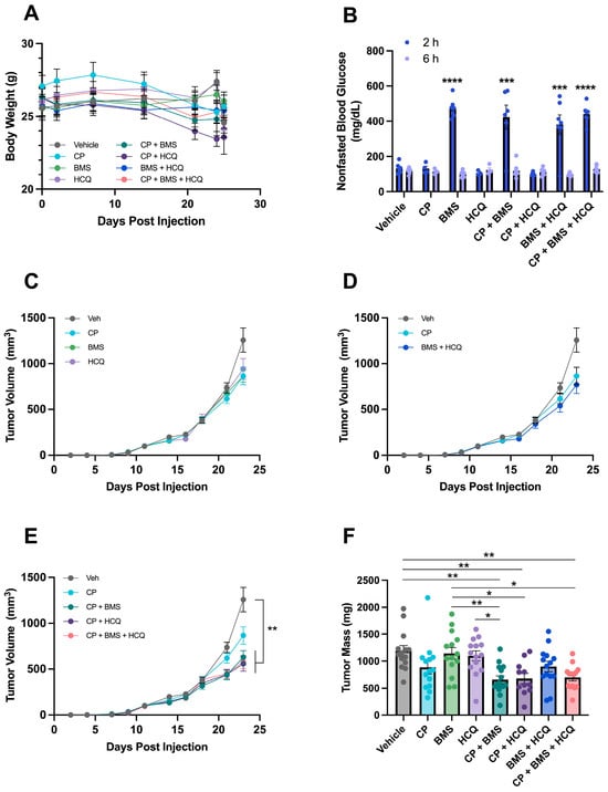 Separate and combined effects of BMS-754807, HCQ, and CP on tumor mass in a metM-Wntlung model of TNBC. (A) Body weight of mice treated with BMS-754807, CP, HCQ, or combinations; (B) blood glucose was assessed in all groups 2 h and 6 h after dosing with drug combinations; (C–E) tumor volume; and (F) tumor mass at endpoint in mice injected with metM-Wntlung cells. Data presented as mean ± SEM. (B) Effect of drug interventions on blood glucose was analyzed by unpaired t-test with * p < 0.05, ** p < 0.01, *** p < 0.001 and **** p < 0.0001. (F) Differences in final tumor mass across all groups were analyzed using three-way ANOVA and Tukey post hoc test. Different letters indicate significant differences between groups.