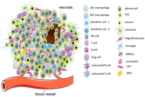 Myeloid cells, namely tumor-associated macrophages (TAMs), myeloid-derived suppressor cells (MDSCs), dendritic cells (DCs), and tumor-associated neutrophils (TANs), are the major contributors both to immunosuppression and tumor progression in GBM; thus, they are expected to have a therapeutic potential in GBM [63]. Here, we describe their role in a concise manner, with the focus on their potential translational value.