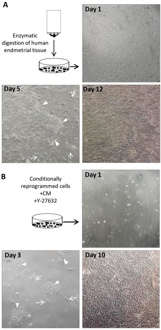The isolation of primary epithelial cells enables, among other things, the elucidation of progesterone resistance, as we are currently also attempting to isolate HPEECs from lesions. Flores et al. [71] showed that patients who responded poorly to progestin therapy had reduced PGR expression. The CR method enables not only the long-term cultivation of HPEECs but also the precise elucidation of the reduced receptor expression. Research into pathways such as receptor methylation can be carried out more easily in a 2D rather than a 3D culture. This would be of interest not only diagnostically but also therapeutically. One possible idea would be to restore PGR responsiveness, which would then enable patients to respond better to progestin therapy [72].