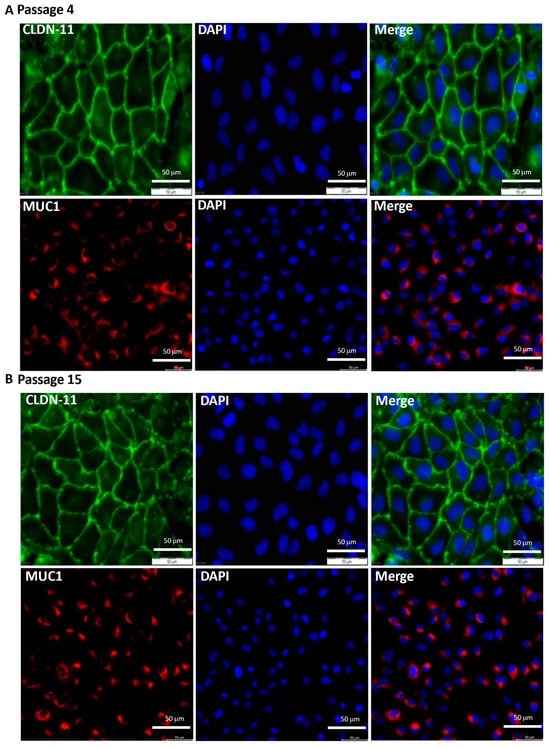 The eCRC560 cells were cultivated in complete CM, and analysis of endometrial epithelial cell markers was performed in early passages ((A); passage 4) and in later passages ((B), passage 15) by staining with antibodies against claudin-11 (CLDN-11) and mucin-1 (MUC1). Positive staining for claudin 11 (green) and mucin-1 (red) characterized the endometrial epithelial cells. These cells retained their epithelial characteristics even after long-term culture (B). Counter-staining was conducted with DAPI (blue), scale bars: 50 µm.
