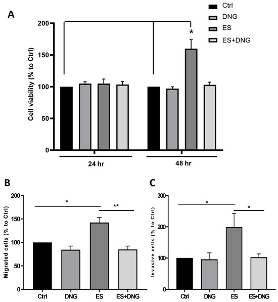 Effects of ES and DNG on epithelial cell viability (A), migration (B), and invasion (C) of eCRC560. Epithelial cells and stromal cells were co-cultivated for 24 h in different compartments in 6-well plates. Only ES significantly increased cell viability after 48 h, which was blocked by DNG (A). ES- and DNG-treated cells were plated onto uncoated (cell migration) or Matrigel-coated (cell invasion) inserts (8 μm pores) with complete CM containing 10% FBS at the bottom of a 24-well plate and stimulated for 24 h. Percent cell invasion (B) and cell migration (C) were calculated as the number of cells that migrated through the uncoated or Matrigel-coated membranes, respectively. ES significantly increased cell migration (B) and invasion (C) as compared to the untreated control (Ctrl). DNG suppressed ES-dependent increased migration (B) and invasion (C). Each bar represents the mean ± SEM of 3 independent experiments performed in duplicates. Dunnett’s test was used for statistical analysis; * p ≤ 0.05, ** p < 0.01.