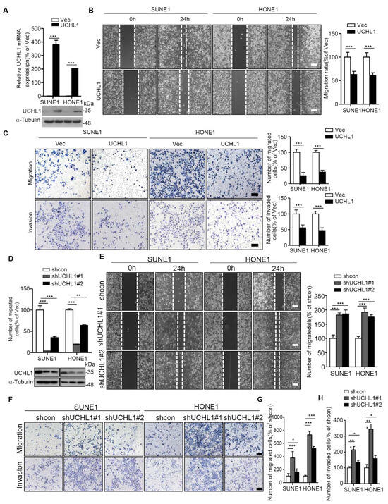 UCHL1 inhibits the migration and invasion of NPC cells in vitro. (A) qRT-PCR analysis of UCHL1 mRNA (up) and immunoblot analysis of UCHL1 and α-tubulin (down) in SUNE1 and HONE1 cells transfected with empty vector or plasmid encoding UCHL1. (B,C) Cell migration was measured using a wound healing assay (×200) (B) and transwell assay (×200) without Matrigel (C). Invasion was measured using a transwell assay with Matrigel (×200) (C). (D) qRT-PCR analysis of UCHL1 mRNA (up) and immunoblot analysis of UCHL1 and α-tubulin (down) in SUNE1 and HONE1 cells transfected with control or shUCHL1(#1 and #2) that stably overexpressed UCHL1. (E–H) Cell migration was measured using a wound healing assay (E) and transwell assay without Matrigel (F,G). Invasion was measured using a transwell assay with Matrigel (F,H). Scale bar:100 µm; Mean ± S.D.; * p < 0.05, ** p < 0.01; *** p < 0.001; Student’s t-tests. Data are representative of at least three independent experiments.