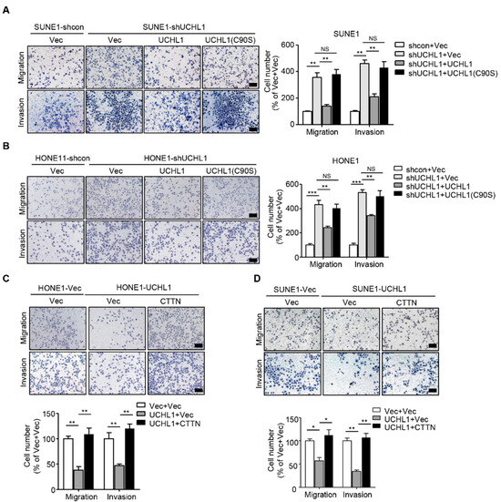 CTTN is a functional and major target of UCHL1 in NPC. (A,B) Transwell assay performed with SUNE1 (A) or HONE1 (B) cells stably transfected with control or shUCHL1 and reconstructed with vector, UCHL1, or UCHL1(C90S) in the presence (invasion) or absence (migration) of Matrigel. (C,D) Transwell assay performed with SUNE1 (C) or HONE1 (D) cells that stably transfected with vector or UCHL1 with reconstructed with vector or CTTN in the presence (invasion) or absence (migration) of Matrigel. Scale bar: 100 µm; Mean ± S.D.; * p < 0.05, ** p < 0.01, *** p < 0.001, NS: no significance compared with vector; Student’s t-tests. Data are representative of at least three independent experiments.