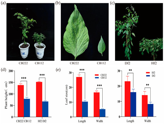 (a) Phenotypic characteristics of the two pepper varieties (CB112 and CB222); (b) leaf morphology; (c) F2 generation plant comparison; (d) plant height difference between CB112 and CB222, and plant height difference between Df2 and Hf2; (e) leaf size difference between CB112 and CB222 and leaf size difference between Df2 and Hf2. (** denotes p < 0.01, *** denotes p < 0.001.)