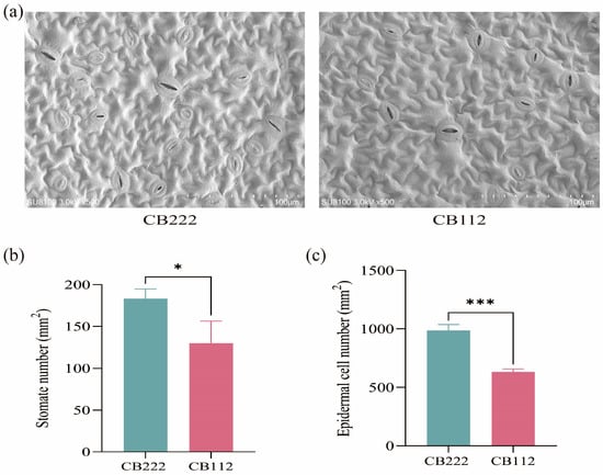 Scanning electron microscopy (SME) observations of CB112 and CB222 leaves. (a) CB112 and CB222 leaves; (b) stomata number per mm2 of CB112 and CB222 leaves; (c) epidermal cell number per mm2 of CB112 and CB222 leaves. (* denotes p < 0.05, *** denotes p < 0.001.)