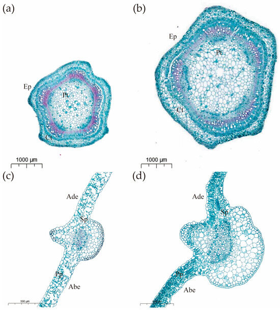 (a) CB112 stem cross section (×1.4); (b) CB222 stem cross section (×1.4); (c) CB112 leaf cross section (×3.5); (d) CB222 leaf cross section (×3.5). (Ep: epidermis; Ct: cortex; Pt: pith; Ade: adaxial epidermis; Abe: abaxial epidermis; Sp: spongy parenchyma; Pp: palisade parenchyma.)