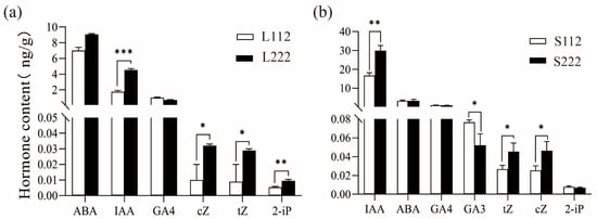 Comparison of the hormone content in CB112 and CB222 pepper plants. (a) Differences in hormone content in CB112 and CB222 leaves; (b) differences in hormone content in CB112 and CB222 stem internodes. (* denotes p < 0.05, ** denotes p < 0.01, *** denotes p < 0.001.)