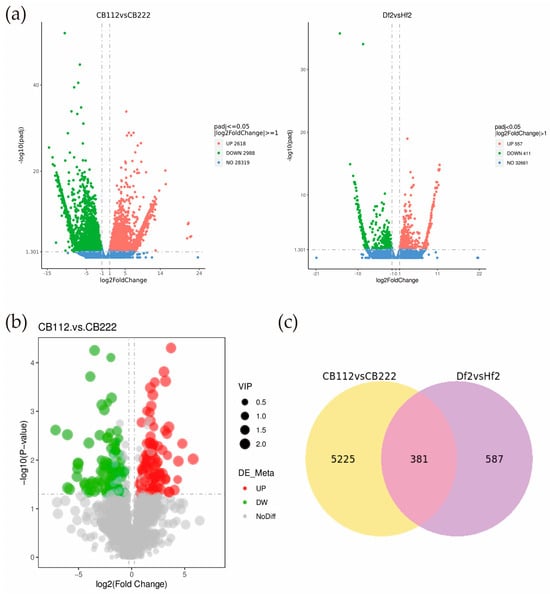 Volcan map of differential metabolites and volcan map and Venn diagram of DEGs. (a) CB112 vs. CB222 and Df2 vs. Hf2 volcan map diagram of DEGs; (b) common DEGs between CB112 vs. CB222 group and Df2 vs. Hf2 group; (c) CB112 vs. CB222 and Df2 vs. Hf2 Venn diagram of DEGs.