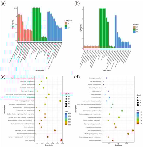 GO and KEGG pathway enrichment analysis. (a) CB112 vs. CB222 GO pathway enrichment analysis; (b) Df2 vs. Hf2 GO pathway enrichment analysis; (c) CB112 vs. CB222 KEGG pathway enrichment analysis; (d) Df2 vs. Hf2 KEGG pathway enrichment analysis.