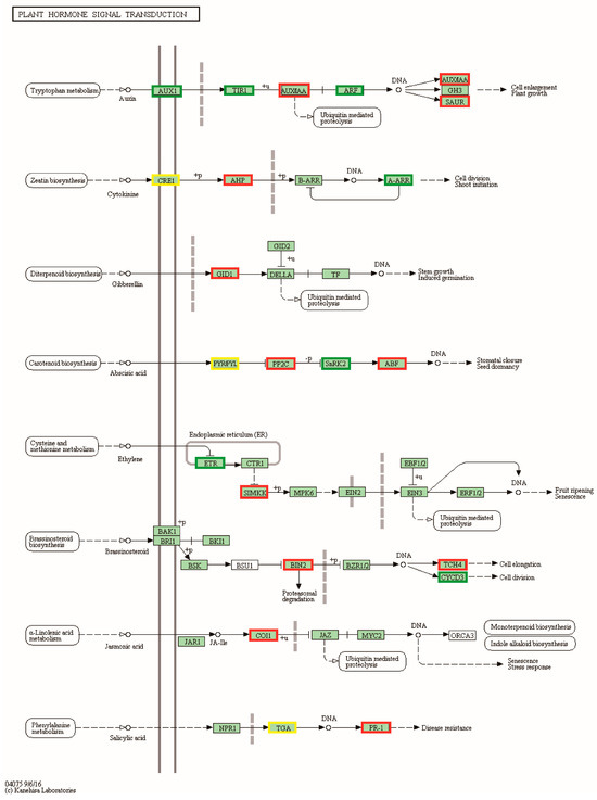 CB112 vs. CB222 plant hormone signal transduction. Red markers are associated with up-regulated genes, green markers with down-regulated genes and yellow markers are associated with both up- and down-regulated genes.