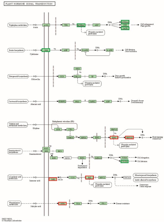 To further understand the mechanisms associated with pepper plant height and leaf size, our study concentrated on differential genes involved in the plant hormone signal transduction pathway (cann04075) and differential genes shared by both combinations. Thirty-eight differentially expressed genes were identified in the plant hormone signal transduction pathway of the CB112 and CB222 groups (Figure 7). Seven genes exhibited enrichment in the auxin signaling pathway, encompassing auxin-responsive proteins (SAUR36 and IAA17) and auxin response factor (ARF5); six genes, including (AHK3, AHK4, and ARR15) were enriched in the cytokinin signaling pathway; GID1B was found to be enriched in the gibberellin signaling pathway; and twenty-four genes were enriched in the signaling transduction pathways of the brassinosteroid, abscisic acid, ethylene, and jasmonic acid. Fourteen differentially expressed genes involved in the plant hormone signal transduction pathway were identified in the Df2 and Hf2 combination (Figure 8), including the auxin-responsive protein (SAUR20), auxin-responsive promoter (JAR6), and auxin-inducible protein (AUX22); cyclin-D3-2 (CYCD3-2); and ethylene-response factor (ERF.C.3) and ethylene insensitive (EIN3) genes, etc.