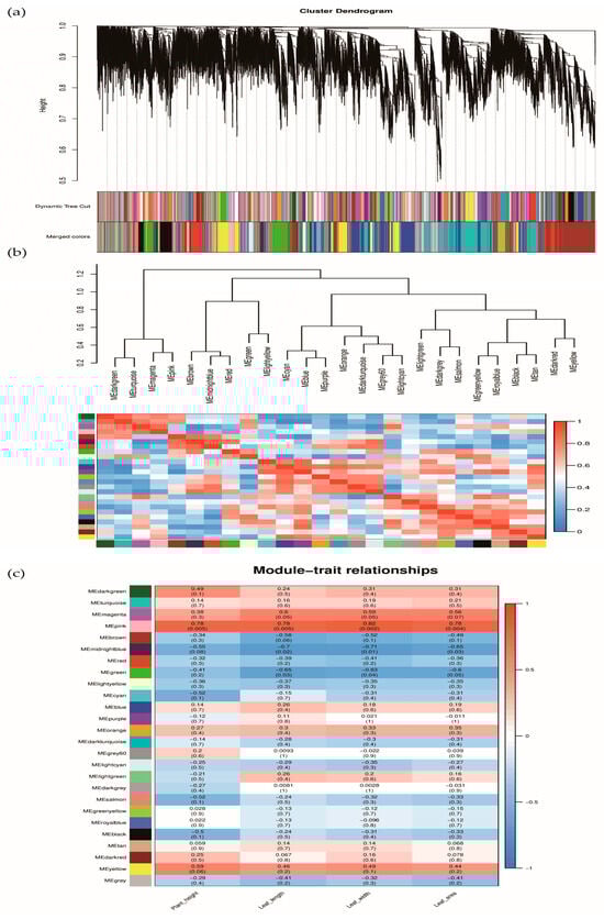 (a) Module hierarchy clustering tree diagram; (b) Heat map of inter-module correlations; (c) Heatmap of association between co-expression network modules of genes and physiological indicators.