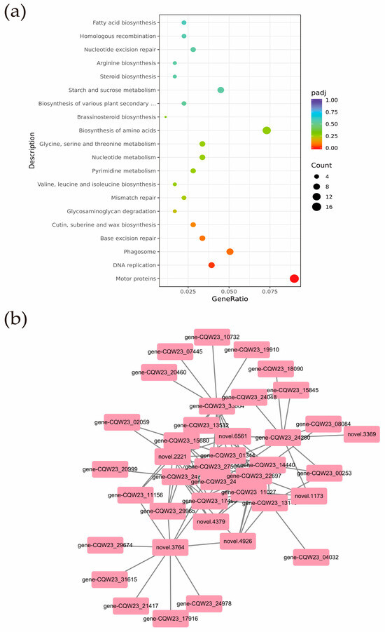 A total of 831 genes from the MEpink module were selected for KEGG analysis (Table S9). The results showed that genes in the MEpink module were mainly enriched in pathways such as motor proteins and DNA replication, in which the brassinosteroid biosynthesis pathway was related to phytohormone biosynthesis (Figure 10a). Motor proteins depend on cytoskeletal proteins to convert chemical energy into mechanical energy and are essential for plant and animal cell growth and cell division. Scientists identified and demonstrated a kinesin-type motor protein with transcription factor activity whose mutation resulted in reduced levels of gibberellin (GA) synthesis and blocked cell elongation [23].