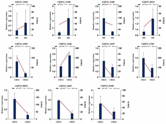 To validate the RNA-seq results, 11 genes with different expression levels and functions were selected for qRT-PCR including the auxin-induced protein (CQW23_11540), protein TIFY 10b (CQW23_11488), cyclin-D3-2 (CQW23_05211), ethylene-responsive transcription factor (CQW23_29930), auxin-responsive protein (CQW23_11539), abscisic acid receptor (CQW23_00243), bZIP transcription factor (CQW23_28467), etc. The expression profiles of the 11 genes shown in the results are consistent with the RNA-seq expression results, suggesting the accuracy and reliability of the transcriptome data (Figure 11).