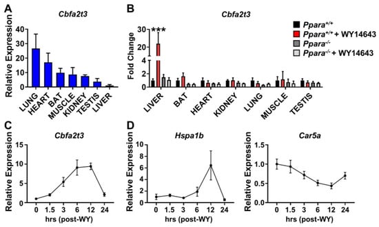 PPARA induces hepatic Cbfa2t3. WY14643 was administered to Ppara+/+ and Ppara−/− mice for 2 days. (A) Relative basal Cbfa2t3 mRNA expression in tissues. (B) Cbfa2t3 mRNA expression in mice with and without WY14643. (C) Time course for changes in expression in liver of Cbfa2t3 mRNA following WY14643 administration. (D) Time course for changes in expression in liver of Hspa1b and Car5a mRNAs following WY14643 treatment. Each data point represents the mean ± SD for n = 5. *** p < 0.001 vs. Ppara+/+.