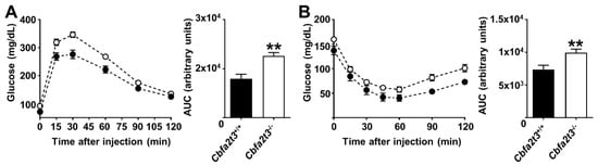To explore the role of Cbfa2t3 in glucose metabolism and insulin sensitivity, GTT and ITT were performed in Cbfa2t3+/+ and Cbfa2t3−/− mice. GTT results showed that blood glucose levels were increased in Cbfa2t3−/− mice compared to Cbfa2t3+/+ mice (Figure 2A). ITT results also showed that blood glucose levels were increased after injection of 0.8 U/kg insulin, which was clearly marked in Cbfa2t3−/− mice compared to Cbfa2t3+/+ mice (Figure 2B). These data suggest that Cbfa2t3 modulates metabolic stress (Figure 2A,B).