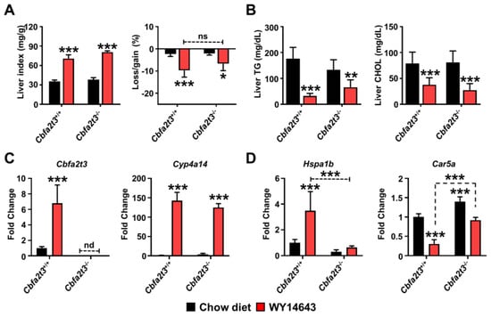 Impact of Cbfa2t3 deficiency in the liver. WY14643 administered to Cbfa2t3+/+ and Cbfa2t3−/− mice for 2 days. (A) Liver index (mg liver/g total body mass) and body weight loss in Cbfa2t3+/+ and Cbfa2t3−/− mice. (B) TG and CHOL levels in Cbfa2t3+/+ and Cbfa2t3−/− mice. (C) Expression of Cbfa2t3 and Cyp4a14 mRNA in Cbfa2t3+/+ and Cbfa2t3−/− mice. (D) Expression of Hspa1b and Car5a mRNA in Cbfa2t3+/+ and Cbfa2t3−/− mice with and without WY14643. Each data point represents the mean ± SD for n = 5. * p < 0.05; ** p < 0.01; *** p < 0.001 vs. Cbfa2t3+/+.