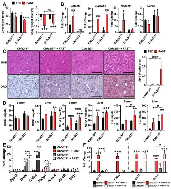 Cbfa2t3 null causes lipid accumulation during fasting. Cbfa2t3+/+ and Cbfa2t3−/− mice were fasted for 24 h. (A) Liver indexes (mg liver/g total body mass) and body weight loss after fasting. (B) Expression of Cbfa2t3, Cyp4a14, Hspa1b, and Car5a mRNA after 24 h of fasting. (C) Liver H&E and ORO staining after 24 h fasting. Scale bars represent 100 nm (200×). At least 10 cells were quantified in each image for calculating the lipid droplet area. (D) CHOL, NEFA and TG levels from serum and liver tissues after 24 h. (E) Expression of lipid accumulation-related genes after 24 h fasting. (F) Expression of Cd36 and Cidea mRNA in liver of Ppara+/+, Ppara−/−, Cbfa2t3+/+ and Cbfa2t3−/− mice after WY14643 administration for 2 days. Each data point represents the mean ± SD for n = 5. * p < 0.05; ** p < 0.01; *** p < 0.001 vs. Cbfa2t3+/+, vs. Ppara+/+.
