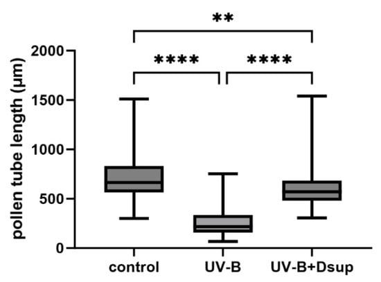 Measurement of pollen tube length under the conditions described in Experiment 2. Pollen grains were transformed and germinated for 4–5 h prior to UV-B exposure. The graph depicts the growth rate of pollen tubes in three cases (control, UV-B stress only, and Dsup transformation followed by UV-B). UV-B treatment significantly reduces pollen tube elongation (**** p < 0.0001). UV-B treatment with Dsup transformation partially restores pollen tube growth compared to the control (** p < 0.01), sometimes even exceeding it.