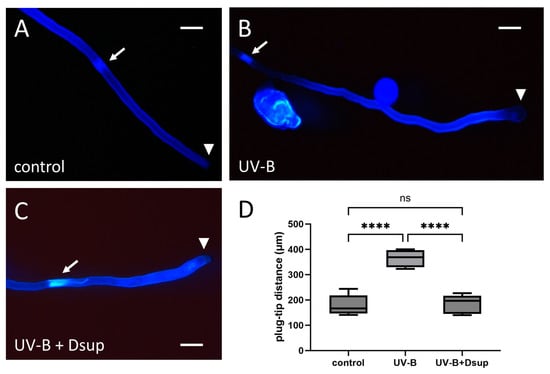 Effect of UV-B treatment on the position of the last formed callose plug in tobacco pollen tubes with/without Dsup expression (Experiment 2). (A) Control pollen tubes stained with aniline blue. The arrow indicates the last callose plug formed, while the arrowhead indicates the tip of the pollen tube. (B) Pollen tubes treated with UV-B; again, the arrow indicates the final callose plug and the arrowhead indicates the pollen tube tip. (C) Pollen tubes expressing Dsup, then treated with UV-B; the arrow indicates the final callose plug and the arrowhead indicates the tube tip. (D) Graph depicting the position of the last callose plug in the three cases studied. Control samples have uniform distances (around 200 μm on average). UV-B stress resulted in a value of 350–400 μm. After transformation, the data were homogeneous and comparable to the control. The control sample differed statistically from the UV-B treatment (**** p < 0.0001), as did the UV-B-treated sample, which differed from the UV-B-transformed sample (**** p < 0.0001). The control did not differ statistically from the treated or transformed samples (ns).