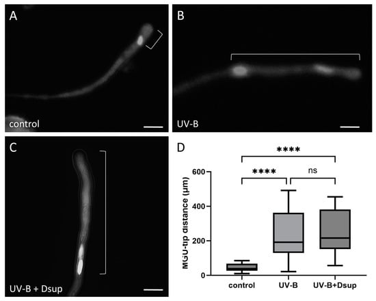 Analysis of the effect of UV-B stress on the position of the male germ unit in tobacco pollen tubes, both with and without transformation with Dsup (Experiment 2). (A) Control pollen tubes stained with DAPI. (B) UV-B-treated pollen tubes. (C) Dsup-transformed pollen tubes subjected to UV-B treatment. The square bracket indicates the distance between the MGU and the tip of the tube. (D) Measurements of the position of the MGU relative to the tube tip in the three cases studied. In control samples, the “MGU/tip” distance is uniform and averages around 40 μm. UV-B-stressed samples exhibited data ranging from 200 to 400 μm. After transformation, the data remained highly heterogeneous, with an average of 250 μm. The control differs significantly from the UV-B-treated and transformed samples (**** p < 0.0001). There was no difference between the UV-B-treated and transformed samples (ns).